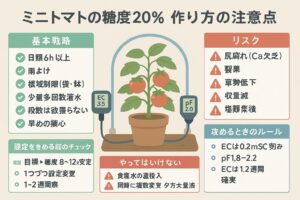糖度20%という水準は商業栽培でも高度な環境制御を要する領域で、成功の鍵は「水の入り方を徹底してコントロールすること」と「過度なストレスで株を壊さないこと」の両立にあります。栽培研究では、培養液ECを高める、根域を制限する、雨よけで余剰水を遮断する、などの手法で糖度は上がりやすくなる一方、草勢低下・収量減・障害果増(尻腐れ・裂果など)のリスクが指摘されています。家庭菜園では、まず日照の最大化と雨よけによる水分制御から始め、根域制限(袋・鉢)で変動幅を小さくしつつ、段数を欲張らずに早めの摘心で栄養の行き先を絞る設計が現実的です。