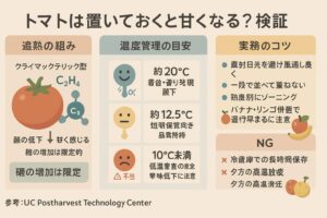 保存・流通温度帯の科学的根拠は学術機関のポストハーベスト資料に整理されています。温度選択が食味と歩留まりに直結するため、値を根拠にした管理が役に立ちます(出典:University of California Postharvest Technology Center Produce Facts: Tomato https://postharvest.ucdavis.edu/produce-facts-sheets/tomato)。
