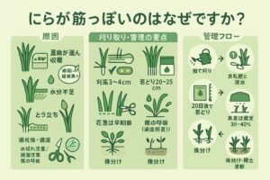 生育速度を落とさない施肥と潅水のリズム、若どりの徹底、真夏の部分遮光、そして定期的な株更新を組み合わせると、硬化の連鎖を断ちやすくなります。なお、光・温度・CO₂など環境がニラの光合成や生育に及ぼす影響は、都道府県の試験場報告でも検証されています(出典:栃木県農業試験場研究報告 第88号「ニラの高品質・周年栽培のための生理生態解明と栽培技術の確立」 https://www.agrinet.pref.tochigi.lg.jp/nousi/kenpou/kp_088/kp88_nira.pdf)。