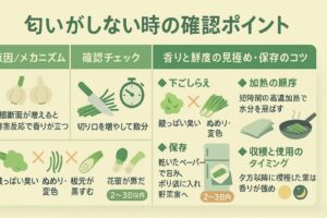 収穫直後に香りが弱いと感じる場面は珍しくありません。ニラの香りは硫黄化合物が主で、切断時に酵素反応が進むことで立ち上がります。切り口を増やして数分置くと香りが感じやすくなります。一方で、酸っぱい臭いや発酵臭、ぬめり、変色は鮮度低下のサインです。葉基部の白い部分を折ったときに水分が戻らず黒ずむ場合は、使用を避ける判断が安全側です。