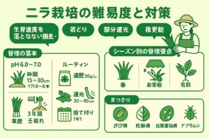 刈り取り基準や遮光・温度管理がニラの品質に与える影響は地方試験場の研究でも検討され、若どりの徹底と環境制御が品質安定に寄与すると報告されています(出典:栃木県農業試験場 研究報告 第88号「ニラの高品質・周年栽培のための生理生態解明と栽培技術の確立」https://www.agrinet.pref.tochigi.lg.jp/nousi/kenpou/kp_088/kp88_nira.pdf)。