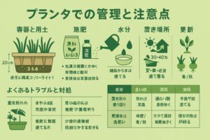 プランターでは環境変動が地植えより速く現れます。観察→微調整をこまめに繰り返すほど、葉質は安定し、柔らかい収穫が続きます。
