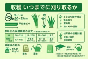 上表は管理の目安であり、気温・日照・土壌水分で前後します。連続収穫では、毎回の刈り取り直後に少量のお礼肥(例:化成肥料30g/㎡目安)と十分な潅水を行うと、次芽の立ち上がりが揃い、硬化リスクを抑えられます。