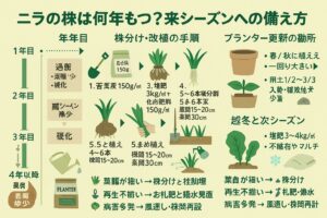 これらの更新サイクルを計画的に回すことで、葉質の低下や硬化を抑えながら、来シーズン以降も安定した収穫が期待できます。栽培環境の観察と小さな調整を積み重ねるほど、株の寿命と品質は長続きします。