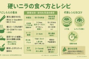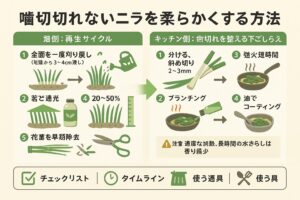 硬さが出た局面では、畑側の更新管理とキッチン側の下ごしらえを組み合わせると改善が速く進みます。畑側は「捨て刈り→お礼肥と潅水→部分遮光→若どり」の循環を短期で回し、葉齢をリセットします。キッチン側は、切り分けと加熱順序を最適化して歯切れを整えます。
