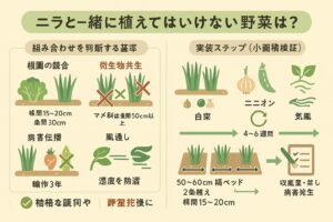 絶対的に避けるべき組み合わせが広く合意されているわけではありませんが、根圏環境や病害リスクの観点から注意したいポイントがあります。ネギ属は根圏で独特の香味成分を放出し、土壌微生物相に影響を及ぼす可能性が指摘されます。共生微生物への依存が大きい作物(根粒菌に依拠するマメ科など)では初期生育が敏感な場合があるため、狭い条間での混植は避け、区画を分けて管理すると安全側です。一方で、ネギ属の香りを利用して一部の害虫回避を狙う事例もありますが、圃場条件で結果が分かれやすく、小面積の試験区で検証してから広げる手順が現実的です。