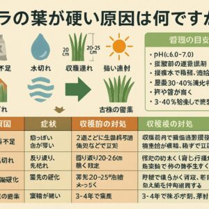 葉が硬く感じられる背景には、栄養・水分・収穫タイミング・光環境・株齢の五つの要因が重なりやすいです。窒素やカリなどの養分が不足すると光合成量が落ち、葉肉の厚みが増えず繊維感が前面に出ます。水分ストレスがかかると細胞内の水ポテンシャルが低下して萎れやすくなり、その後に回復しても細胞壁のリグニン化が進み、硬化につながります。草丈を伸ばしすぎると葉齢が進み、導管・繊維束の比率が相対的に高まり、噛み切りにくさが増します。真夏の直射は葉温を上げ、蒸散が過剰になりやすく、結果として葉が厚くても硬く感じられます。古株では分げつが過密になり、葉幅が細く薄くなるうえ、再生力が落ちて品質が不安定になります。