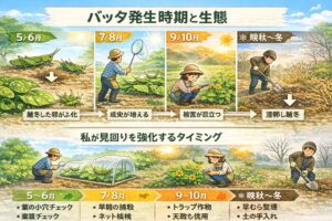 ここでは「まず何を見て、何から手を付けるか」を整理します。バッタは種類や時期で動き方が変わるので、最初に全体像をつかむと対策がラクになります。あなたの畑の状況に当てはめながら読んでみてください。
