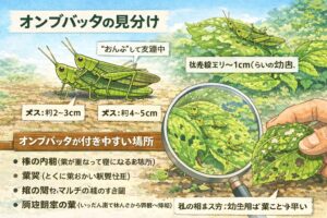 オンブバッタは登録農薬が少ない・使いづらいケースもあるので、無農薬でいくなら「見回り+物理対策」が王道になります。面倒に感じるかもですが、慣れてくると1日2〜3分の習慣で被害がかなり減るので、結果的にいちばん時短になりやすいです。