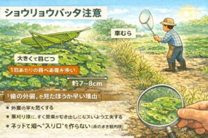 目合いは作物と害虫で最適が変わりますが、バッタの幼虫まで意識するなら細かめが安心です。とはいえ、細かいほど通気が落ちたり、管理が少し難しくなる面もあります。だから私は、苗期は細かめ、株が大きくなったら状況で外す、みたいに柔軟に使っています。