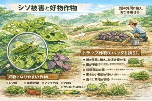 「全部守るの無理…」ってときは、発想を変えておとり(トラップ)を作るのも手です。たとえば、シソやバジルが毎年やられるなら、畑の端にシソを多めに植えて“そっちに集める”作戦。食われたらその場所で捕殺しやすくなるので、結果的に本命野菜の被害が落ち着くことがあります。