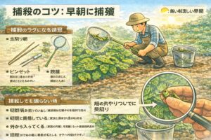 - 即効性:早朝の捕殺(幼虫期ほど効く)