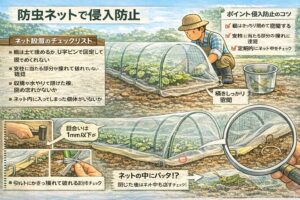 防虫ネットの張り方や、虫全般のブロック発想は他の害虫でも共通なので、必要なら以下も参考になります。