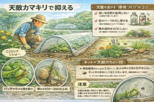 家庭菜園ならではの工夫として、ネットの中にクモやカマキリがいたら、そっとそのままにしておく人もいます。閉鎖空間なので、害虫が入ったときに捕食が起きやすいんですよね。もちろん、天敵に頼り切るのは危険ですが、捕殺やネット点検と併用すると、じわっと効いてくることがあります。