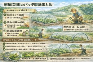 最後に大事な話をすると、木酢液やニームは“ゼロにする”道具というより、被害を許容範囲に収めるための調整弁です。ネットや捕殺で土台を作った上で使うと、グッと安定しますよ。
