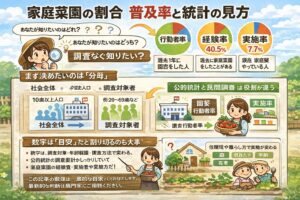 私は家庭菜園の割合を整理するとき、最初に分母を3つに分けて考えます。①社会全体(10歳以上人口など)、②調査対象者(20〜69歳など)、③家庭菜園経験者・実施者(やっている人の中での割合)。このどれを分母にするかで、数字は大きくも小さくも見えます。分母が違う数値を横並びで比較すると、誤解が生まれやすいんですよね。
