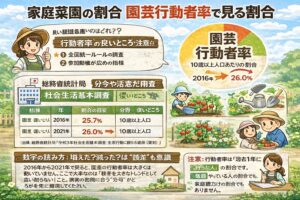 家庭菜園の割合って、いざ調べると「何割の人がやってるの?」「普及率は?」「統計はある?」みたいに、知りたいポイントがバラけがちですよね。しかも家庭菜園の割合は、行動者率なのか、経験率なのか、実施率なのかで数字が変わります。ここ、気になりますよね。