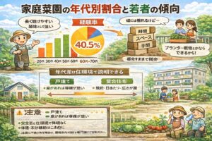 一方で「今やっている人(実施率)」は、経験率より小さく出やすいです。同じ枠組みの調査でも、現在、庭や畑で作っている割合が7.7%という数字が示されることがあります。ここが混ざると誤解が起きやすいので、私は記事内では必ず分けて書きます。経験率40.5%を見て「今も4割がやってる」と受け取るとズレます。あくまで“やったことがある”まで含むので。