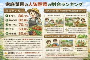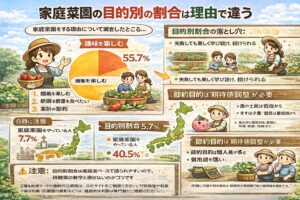 この記事では、園芸行動者率のような公的な近似データと、家庭菜園の経験率・実施率を出す調査を分けて、年代別や県別の地域差、ベランダ菜園の割合、人気野菜やトマトの割合まで、あなたが「結局どれが自分の知りたい割合?」を迷わない形でまとめます。