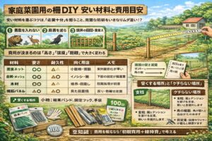 柵DIY安い材料を選ぶコツは、「必要十分」を狙うことです。完璧な防御をいきなり作ると、コストも手間も跳ね上がって続きません。家庭菜園は続けてナンボなので、「今の被害に効く最低ライン」を作って、様子を見ながら強化していくのが現実的かなと思います。