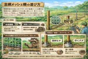 - 大型害獣(イノシシ・鹿)なら強度重視でメッシュや溶接金網が安心