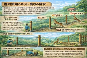 鹿対策は、イノシシと逆で「跳ぶ」が本質です。鹿は障害物を飛び越えるので、ネットやフェンスは高さが効きます。一般論として、高さ2m前後が意識されることが多いですが、地形や周囲の状況で体感の高さが変わるので、あくまで目安として見てください。ここは断定しにくい部分なので、現場の状況を優先して考えるのが安全です。