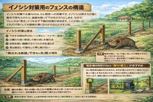 電気柵を使わない場合でも、防獣柵自作は「弱点を作らない」運用が重要です。出入口の閉め忘れ、隙間、支柱のぐらつきは、害獣にとっては全部チャンスになります。ここは地味だけど、効くポイントです。