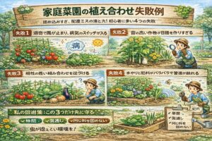 よくある失敗は、だいたいこの4つに集約されます。過密で風が止まる、背の高い作物が日陰を作りすぎる、相性の悪い組み合わせを近づける、水やりと肥料がバラバラになる。植え合わせは「多品目」を詰めたくなるんですが、詰めすぎると病気のスイッチが入ります。