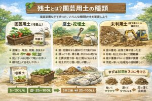 家庭菜園で出る残土は、ひとことで言うと「今の場所で余ってしまった土」なんですが、実際は中身がバラバラです。ここをざっくり整理すると、あとがすごくラクになりますよ。まず多いのが、プランターや鉢で使った園芸用土(培養土)。これは腐葉土や堆肥、赤玉土、軽石系の資材、肥料などが混ざっていて、最初はふかふかでも、繰り返すうちに粒が崩れて締まりやすくなります。水をあげても染み込みにくい、表面がカチカチ、底から水が抜けない…みたいな症状が出たら、土の「物理性」が落ちてきたサインです。
