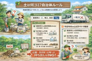 迷ったら、土の写真(全体・混ざり物アップ・湿り具合)を撮って、自治体窓口か許可業者に見せると話が早いですよ。