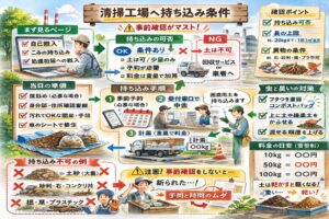 清掃工場や処理施設への持ち込みは、自治体によって可否が分かれます。持ち込みができる場合でも、「土は不可」「土は少量のみ」「予約が必要」「料金は重量で加算」など条件がつくことが多いです。ここを知らずに行くと、現地で断られてめちゃくちゃ疲れるので、事前確認はマストです。