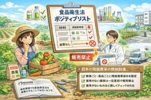 日本では、農薬ごと・食品ごとに「このくらいまでなら大丈夫」という残留基準が設定されています。で、ここでよく出てくるのがポジティブリスト。ざっくり言うと、基準が定められていない農薬と食品の組合せには、原則として一律基準(0.01ppm)が適用され、これを超えると販売・流通できない仕組みです。つまり、「基準がない=自由」ではなく、むしろ基準がない組み合わせほど厳しく見られやすいんですよ。