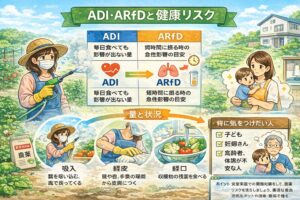農薬の健康影響って、話題が強めなので不安になりやすいですよね。でも、ここは冷静に整理するとラクです。基本は「ゼロか100か」ではなく、量と状況で考えるということ。そこで出てくるのがADI(毎日食べても影響が出ないとされる量の目安)と、ARfD(短時間に摂ったときの急性影響の目安)です。