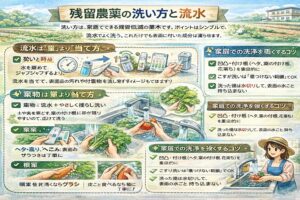 洗い方は、家庭でできる残留低減の基本です。ポイントはシンプルで、流水でよく洗う。これだけでも表面に付いた成分は減らせます。ただ、洗い方にもコツがあって、「ただ濡らす」だけだと効果が弱くなりがちです。ここ、気になりますよね。