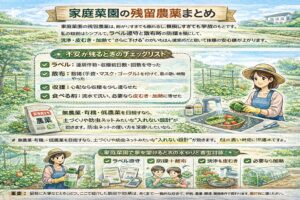 まずは「残留農薬って何を見ればいいの?」の土台づくりから。法律の基準、健康影響の考え方、そして家庭菜園で事故を起こしにくくするルールを押さえます。