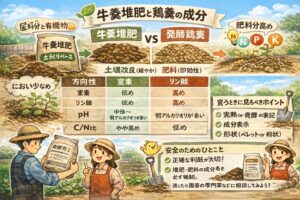 ここではまず、牛糞堆肥と鶏糞堆肥が「同じ堆肥っぽい見た目でも、仕事がぜんぜん違う」ことを整理します。成分、C/N比、土への効き方を押さえると、施用量やタイミングの判断が一気にラクになりますよ。