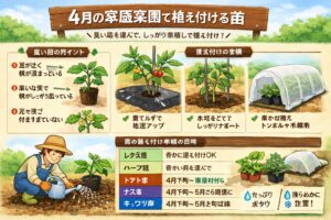 4月は暖かい日が増えますが、地域によっては遅霜や寒の戻りがあります。見た目の気温だけで早植えすると、苗がしおれたり、生育が止まったりしやすいので注意してください。