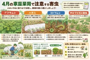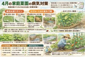 4月後半は、植えたあとにどう守るかが大事になってきます。このパートでは、害虫や病気の予防、地域差によるタイミングのずらし方、初心者の方がやりがちな失敗とその避け方を具体的にまとめます。4月は「植えるまで」も大事ですが、「植えたあと」の観察力が収穫を左右しやすい月です。ほんの少しの違和感に早く気づけると、その後の手間がかなり減りますよ。