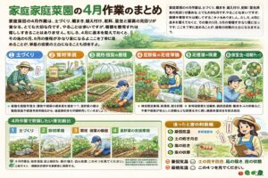 迷ったら、最低気温、土の乾き具合、風の強さ、苗の状態、この4つを見てください。4月はこの4つの変化がそのまま作業タイミングに直結します。暖かい日が数日続いても、夜が冷えるなら定植は待つ。表面が乾いても土の中が湿っているなら水やりは控える。こうした小さな判断の積み重ねが、春の家庭菜園を安定させます。