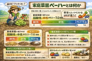 家庭菜園のペーハーは、土の中の栄養が“効きやすいかどうか”を左右します。だから、肥料の量を増やす前に、ペーハーを見たほうが早いことが多いですよ。