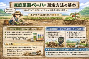 ここからは実践パートです。家庭菜園ペーハー測定の道具選びから、家庭菜園ペーハー調整(酸性・アルカリ性の直し方)まで、手順で整理します。