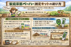 家庭菜園で最初の一歩なら、私は試薬タイプの測定キットを推します。価格が手頃で、失敗しにくいからです。慣れてきて「もう少し数値で追いたいな」と思ったら、デジタルpHメーターを追加する流れが無駄が少ないですよ。