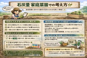 畑の土作り全体の流れ(石灰のあとに堆肥を入れる順番など)は、同サイト内の土作り記事も役立ちます:家庭菜園の土作りの基本