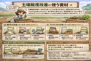 土壌酸度改善は、方向さえ合っていれば怖くありません。酸性を和らげるのか、アルカリ性を和らげるのかで、使う資材が変わります。家庭菜園では“効きの強さ”と“安全性”のバランスが大事なので、私はまずは穏やかな資材から使う派です。