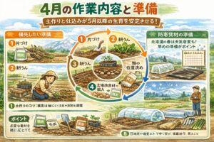 4月の作業全体を広く見直したいなら、サイト内の家庭菜園の4月作業を初心者向けに解説する春の準備完全ガイドもあわせて読むと、地域差を踏まえた作業の考え方がつかみやすいです。