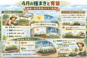 私も北海道の春は、全国向けの家庭菜園情報をそのまま当てはめないことが大事だと感じています。4月はまだ寒さが残るからこそ、植え付けを急ぐより、土作りや育苗、霜よけの準備を先に整えるほうが結果的にうまくいきやすいです。