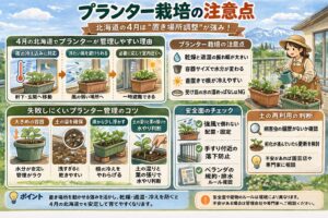 札幌のように比較的動きやすい地域でも、最低気温と霜は最後まで確認したいですし、帯広のように冷え込みが強い地域では、不織布やトンネルをどう使うかが収穫に直結します。プランター栽培なら置き場所を調整しやすいぶん始めやすいですが、水分管理や風の影響を受けやすいので、毎日の観察が欠かせません。つまり、北海道の4月は「何を植えるか」だけでなく、「どう守りながら育てるか」をセットで考えることがとても大切なんです。
