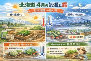 北海道の4月は、見た目には春が進んでいるようでも、家庭菜園の視点で見るとまだかなり慎重に動きたい時期です。日中は日差しが強くなって土の表面が乾きやすくなり、つい「もう植えて大丈夫かな」と思いやすいのですが、朝晩の気温差が大きく、最低気温がぐっと下がる日も珍しくありません。ここ、気になりますよね。特に道北や道東、内陸部では放射冷却の影響を受けやすく、晴れた翌朝ほど冷え込みやすいことがあります。雪が解けて畑が見えてきても、それだけで植え付けの合図とは言い切れないんです。