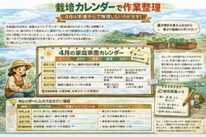 4月の家庭菜園は、できることと、まだ待ったほうがいいことが入り混じる時期です。だからこそ、頭の中だけで進めるより、簡単でもいいので栽培カレンダーを作っておくとかなり管理しやすくなります。ここ、忙しい人ほど効果が出やすいです。思いつきでその日の気温だけを見て動くと、土作りが不十分なまま種をまいたり、苗だけ買って置き場に困ったりしやすいですが、あらかじめ順番を見える化しておくと無理が減ります。