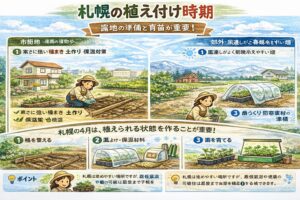 札幌の4月は、露地の植え付けよりも「植えられる状態を作る」ことが重要です。畝を整え、風よけを作り、育苗を進めておくと、5月の動き出しがスムーズになります。